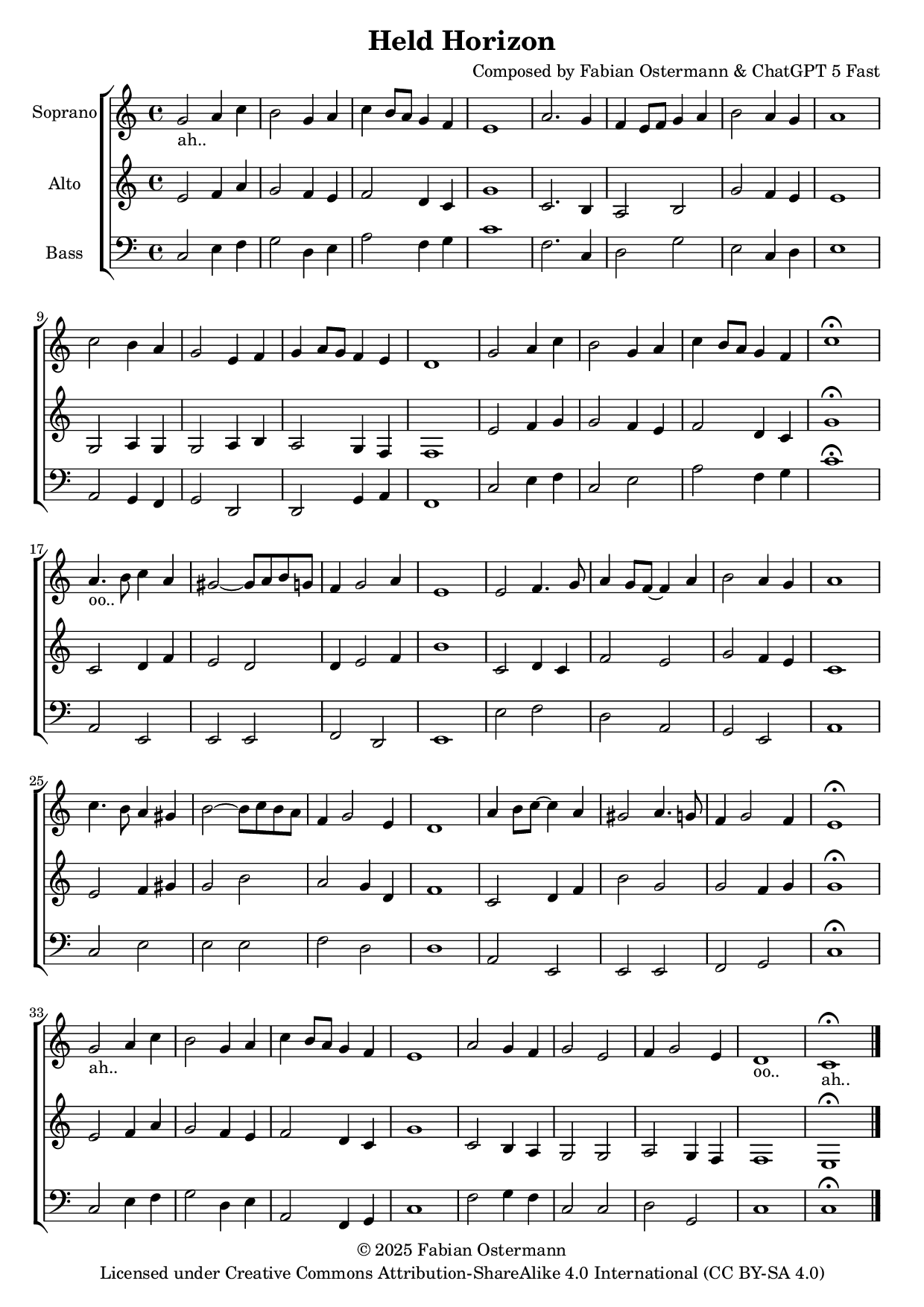 Held Horizon is a collaboratively composed SAB (soprano–alto–bass) choral piece developed for the workshop Choir in the Loop – Singer-Aware AI Composition Practice. The composition follows an ABA′ form and was created through an iterative, dialogical process between the human composer (Fabian Ostermann) and an AI system (ChatGPT 5 Fast).